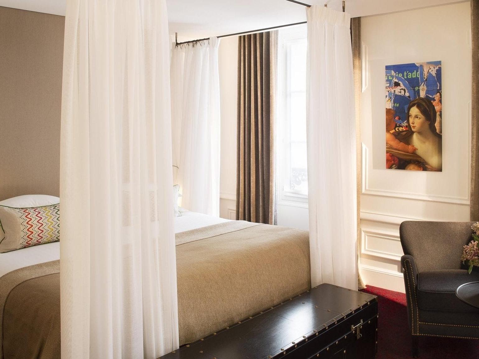 The stay experience is defined by a warm and refined ambience, true to the spirit of an elegant Parisian house where comfort is expressed with subtlety. The rooms favour balanced proportions, refined décor inspired by revisited classicism and a palette of soft materials that invite relaxation. Natural light, calm surroundings and careful attention to detail create a sense of intimacy ideal for disconnecting after a day exploring the city. Each space seems designed to slow down time and savour a suspended moment between contemporary elegance and cultural heritage. The culinary offer focuses on a high-quality breakfast and simple convivial moments, highlighting carefully selected products and a sincere approach to Parisian hospitality.